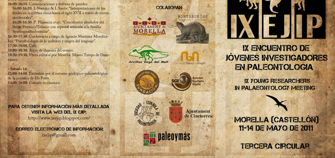 La IX edición del Encuentro de Jovenes Investigadores en Paleontología se celebra este año en Morella 8Castellón). Este EJIP está organizado por la Universidad Complutense de Madrid, la Universidad autónoma de Madrid y la UNED. Paleoymás, como entidad intensamente vinculada a la investigación paleontológica, vuelve a estar entre los patrocinadores de éste evento que reúne a los jóvenes que empiezan su carrera investigadora y que expondrán en Morella sus líneas de trabajo.
